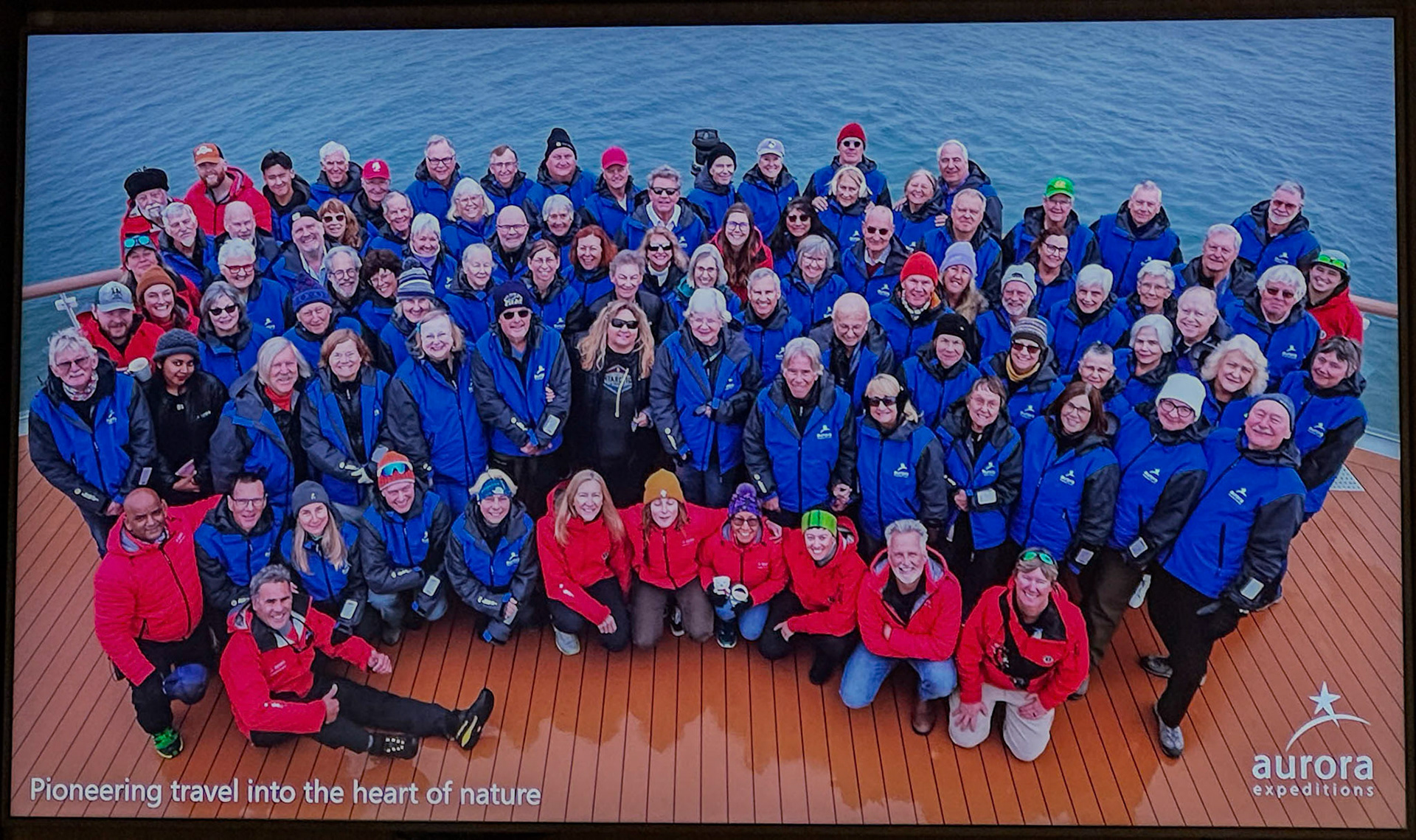 We continued on our way in a dense fog. One foggy photo shows where King Island supposedly was. Took a group photo of the passengers and expedition team.